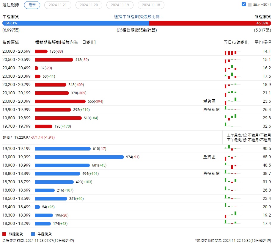 智通财经APP获悉,截至11月23日,恒指最新的牛熊街货比例为55:45。