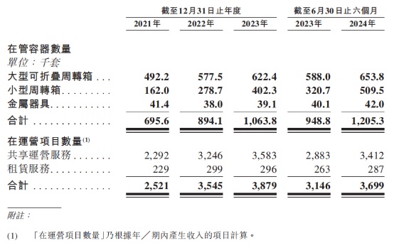 数据显示,2021年至2023年间,公司在管容器数量整体显著增长,除金属器具略有下降外,大型可折叠周转箱及小型周转箱双双上升,截至2024年6月30日止,公司在管的大型可折叠周转箱65.38万套、小型周转箱50.95万套,金属器具4.2万套。