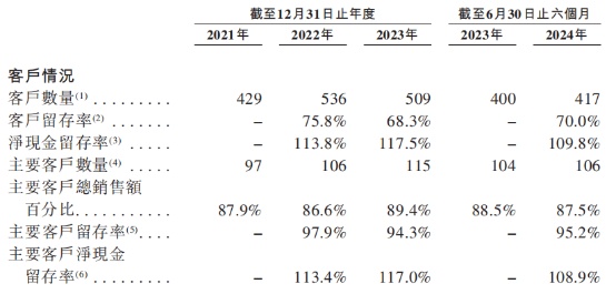 报告期内,尽管公司客户数量从2021年的429家增长至509家,但客户留存率有所下降,从2022年的75.8%下降至2023年的68.3%,下降了7.5个百分点,同期主要客户留存率也从97.9%下降至94.3%。