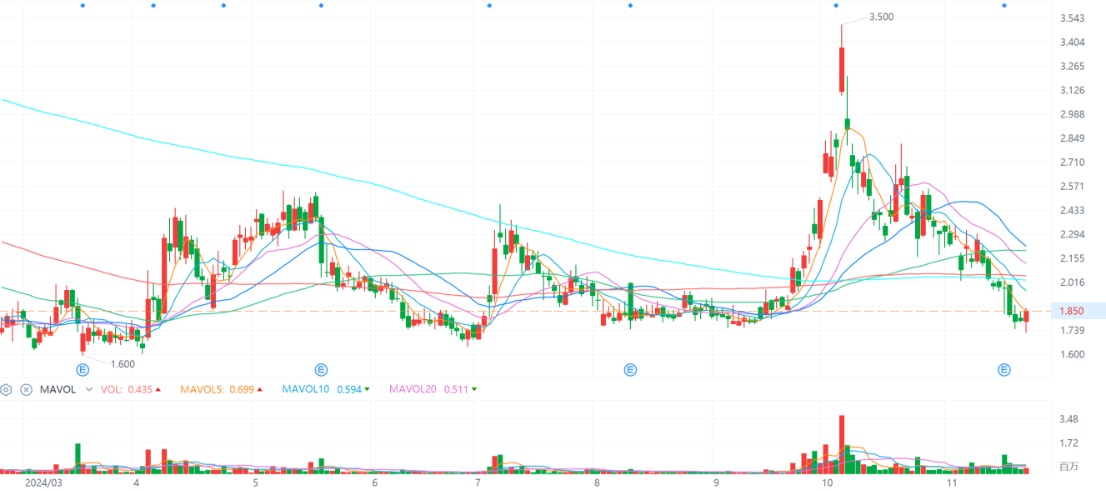 11月22日,小牛电动收涨2.78%,结合前一交易日小幅收涨0.56%的情况来看,在经历了近2个月的股价回调后,小牛电动似乎出现了一定的止跌趋势。从盘面来看,11月22日小牛电动股价开盘即下跌,股价快速下探到近期区间低点1.73美元,跌幅达到3.89%,但随后震荡走高,盘中股价在开盘3个小时后快速升至盘中最高的1.86美元,午盘后股价虽有震荡,涨幅甚至一度收窄至0.83%,但小牛电动股价最终靠着尾盘资金发力站上1.85美元,涨幅也锁定在2.78%。