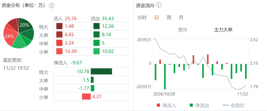 从资金流向来看,11月22日当天整体依然以资金流出为主,当日资金流入25.76万美元,其中小单在流入资金中占比最高,占当日总资金流动量的24%达14.39万美元;当日资金流出35.43万美元,其中特大单在流出资金中占比最高,占总资金量比重为20%。