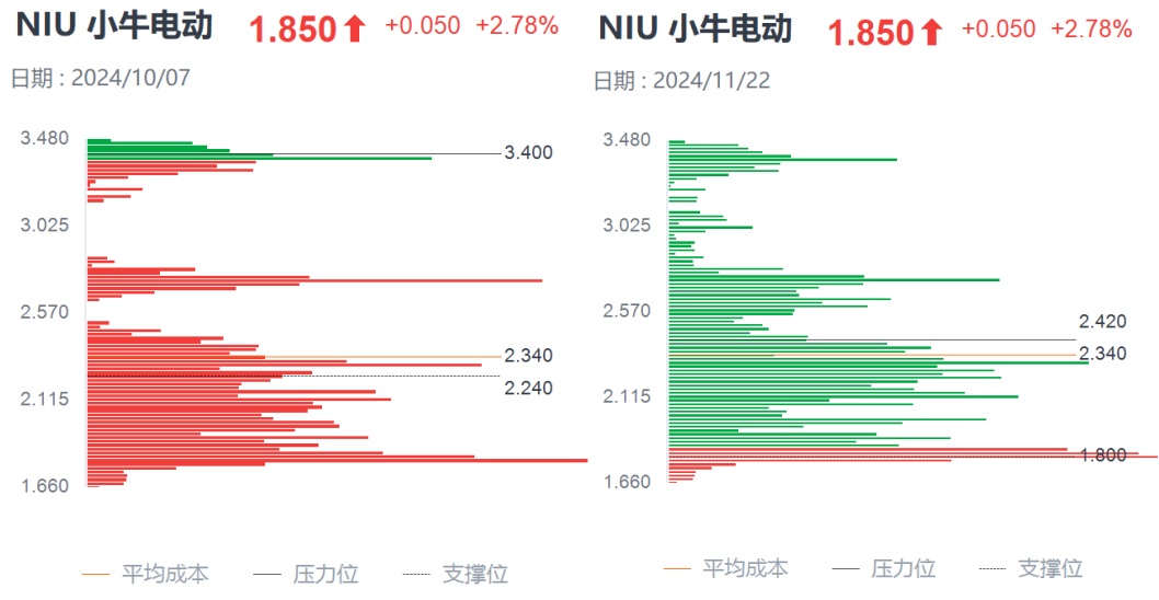 从上图可以看到11月22日小牛电动的筹码平均成本与10月7日相同,均为2.34美元。并且在成本均线附近筹码峰未完全形成,上方仍存在不少高位套牢筹码没有抛出,或说明所谓“洗盘”并未结束。