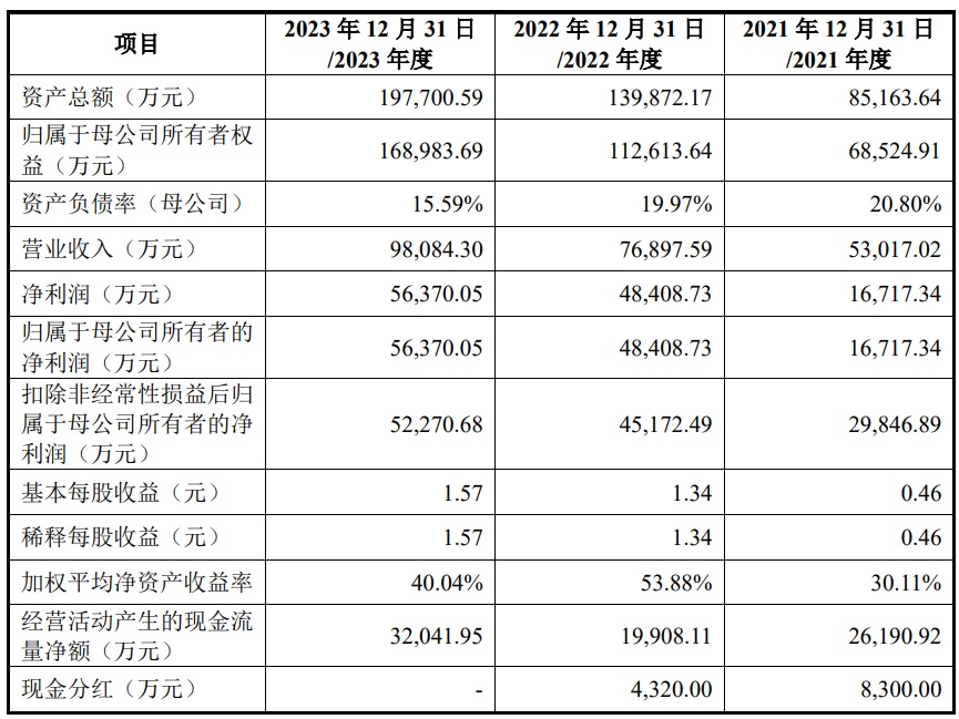 财务方面,于2021年度、2022年度及2023年度,公司实现营业收入分别约为5.30亿元、7.69亿元、9.81亿元。公司净利润分别约为1.67亿元、4.84亿元、5.64亿元人民币。