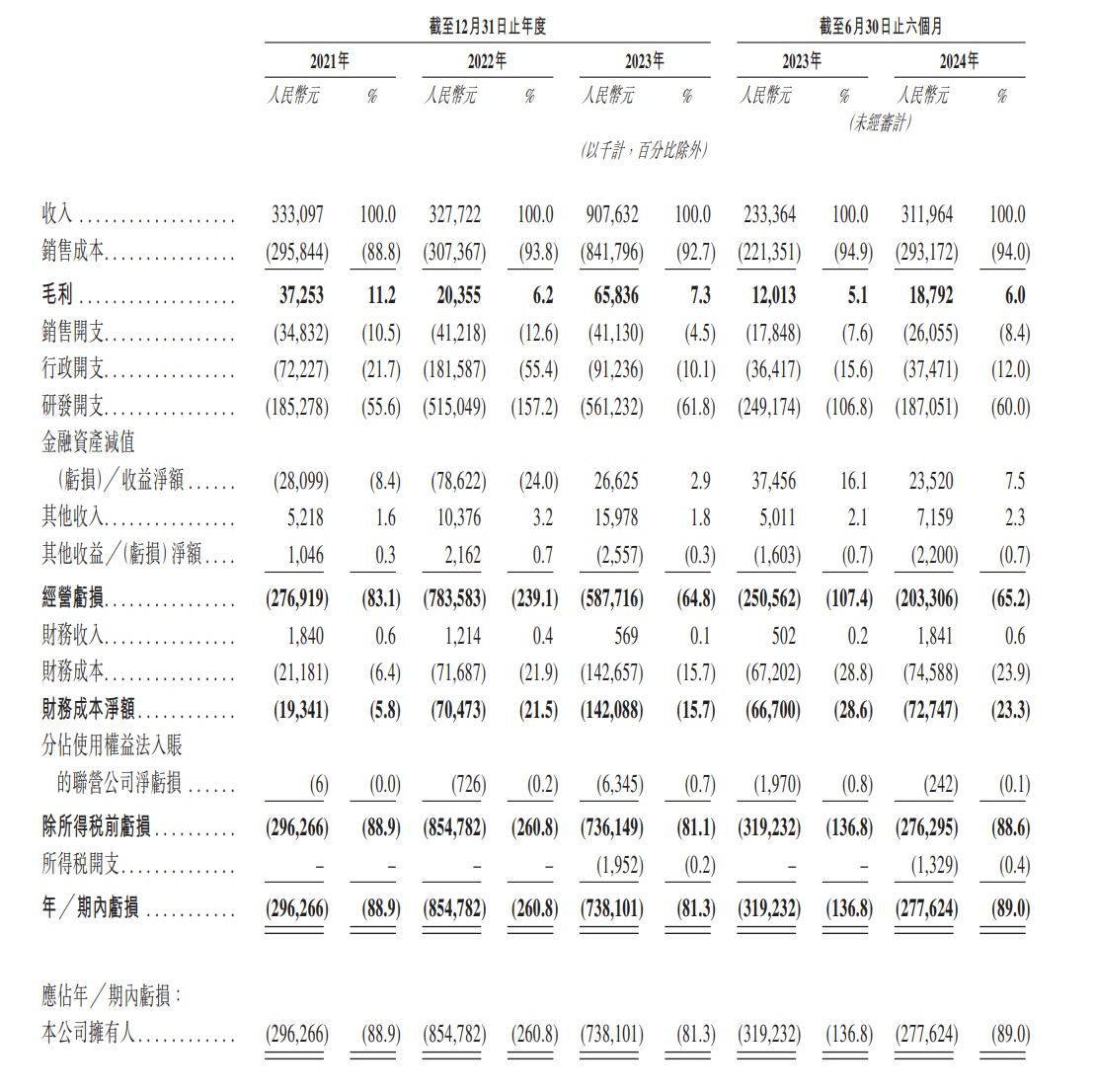 业绩方面,2021年、2022年、2023年、2024年截至6月30日止六个月,福瑞泰克收入分别约为3.33亿元、3.28亿元、9.08亿元、3.12亿元人民币。同期,该公司年内亏损分别约为2.96亿元、8.55亿元、7.38亿元、2.78亿元人民币。