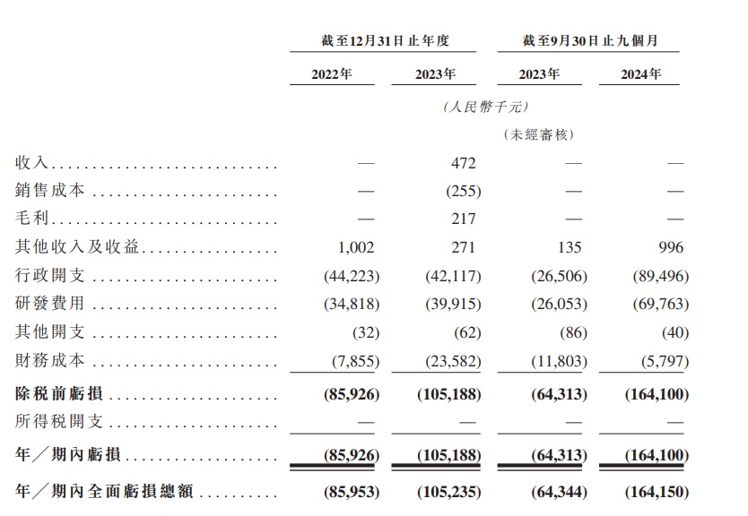 财务方面,截至2022年度、2023年度、2023年及2024年截至9月30日止九个月,华芢生物年/期内全面亏损总额分别约为8595.3万元、1.05亿元、6434.4万元、1.64亿元人民币。