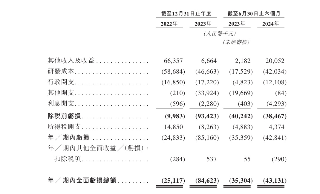 财务方面,2022财年、2023财年及截至2023及2024年6月30日止六个月,公司收入分别约人民币6635.7万元、666.4万元、218.2万元、2005.2万元。 公司于往绩记录期间产生经营亏损。同期公司的全面亏损总额分别为人民币2511.7万元、人民币8462.3万元、人民币3530.4万元及人民币4313.1万元。公司的绝大部分亏损来自研发成本、其他开支、行政开支及利息开支,原因是公司扩展业务运营。