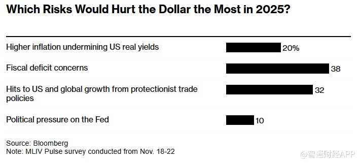 进入明年,89名受访者对美元面临的最大风险看法不一。38%的受访者最担心赤字问题。另有32%的人认为,如果将于明年1月上任的美国当选总统唐纳德·特朗普实施他在竞选期间承诺的关税,明年美国和全球经济增长将会放缓,这将给美元带来压力。