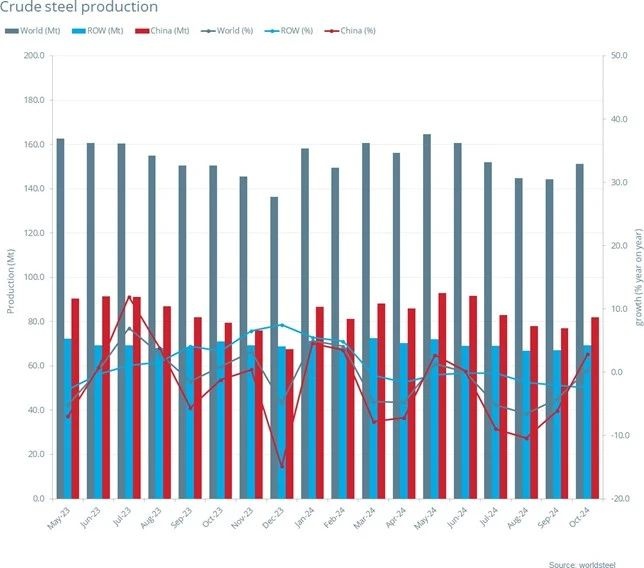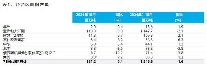 智通财经APP获悉,11月25日,世界钢铁协会发布2024年10月全球粗钢产量。2024年10月全球71个纳入世界钢铁协会统计国家/地区的粗钢产量为1.512亿吨,同比提高0.4%。