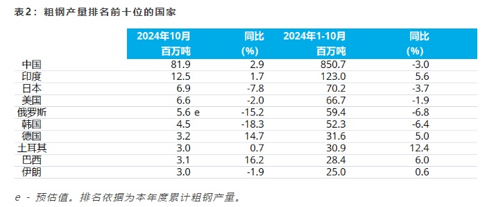 2024年10月,中国粗钢产量为8188万吨,同比提高2.9%;印度粗钢产量为1250万吨,同比提高1.7%;日本粗钢产量为690万吨,同比下降7.8%;美国粗钢产量为660万吨,同比下降2.0%;俄罗斯粗钢预估产量为560万吨,同比下降15.2%;韩国粗钢产量为450万吨,同比下降18.3%;德国粗钢产量为320万吨,同比提高14.7%;土耳其粗钢产量为300万吨,同比提高0.7%;巴西粗钢产量为310万吨,同比提高16.2%;伊朗粗钢产量为300万吨,同比下降1.9%。