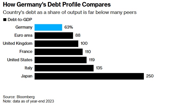 与此同时,德国财政规则使德国政府的整体债务占国内生产总值(GDP)的比例常年保持在60%左右,约为另一欧盟核心成员国法国所面临同等级政府负担的一半。现在,机构投资者们普遍表示,是时候利用这一相对安全的发债位置,加大德国政府借贷规模来提振经济增长。