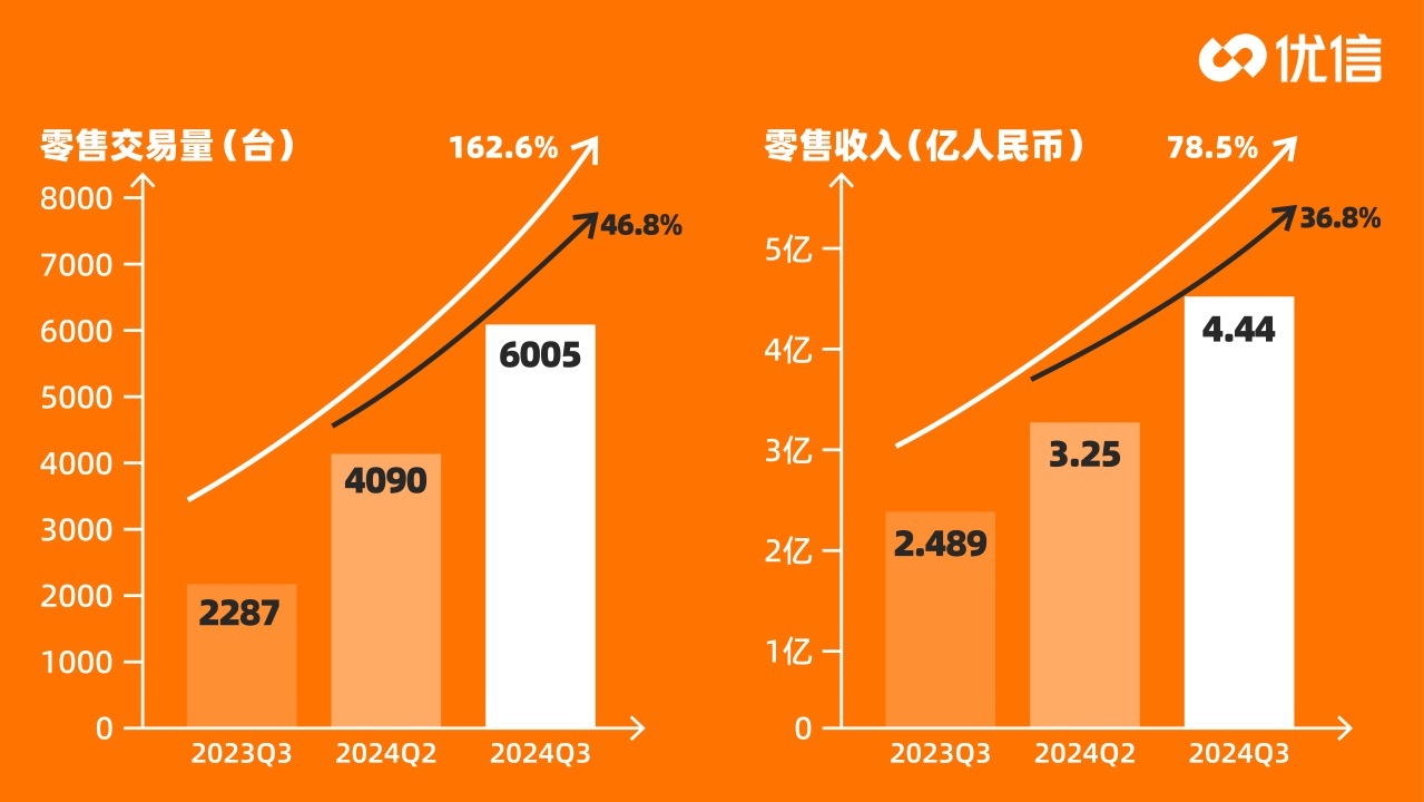 财报显示,本季度,优信交易量为7046台,同比增长81.4%,环比增长25.7%;其中零售交易量创下新高,达到6005台,同比增长了162.6%,环比增长46.8%;季度总收入为人民币4.98亿元,同比增长39.6%,环比增长23.9%。零售收入增至人民币4.44亿元,同比增长78.5%,环比增长36.8%。