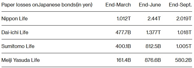 智通财经APP获悉,由于利率上升,日本四大寿险公司持有的日本债券账面损失在截至9月底的财年内较3月份结束时增长了一倍多,达到4.622万亿日元(300亿美元),尽管自6月份以来已有所回升。这些损失引发了保险公司的担忧,可能削弱其偿债能力指标。
