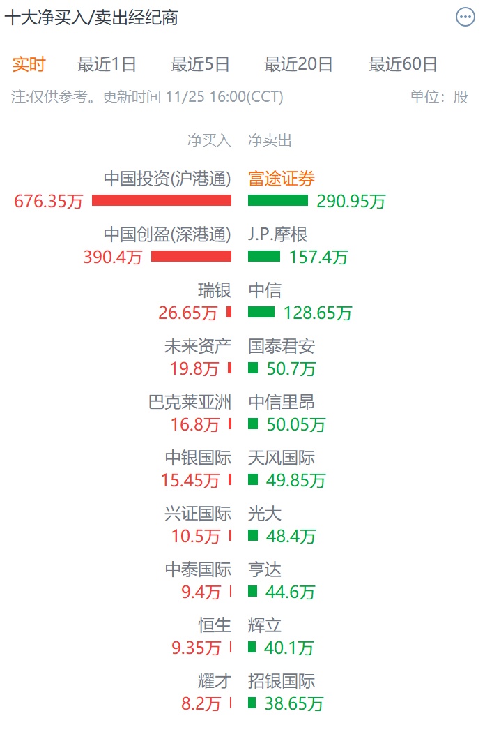 从经纪商买卖席位上看,11月25日,龙蟠科技的主要买方分别为中国投资及中国创盈两个港股通渠道,该前二席位分别买入676.35万股和390.40万股。除此之外,位列买方三至五席的瑞银、未来资产及巴克莱亚洲仅分别买入26.65万股,19.80万股及16.8万股。当日龙蟠科技的前五大卖方席位分别为富途证券、JP摩根、中信证券、国泰君安证券及中信里昂,分别卖出290.95万股、157.40万股、128.65万股、50.70万股和50.05万股。其中,富途和国泰君安为龙蟠科技的前五大经纪商。