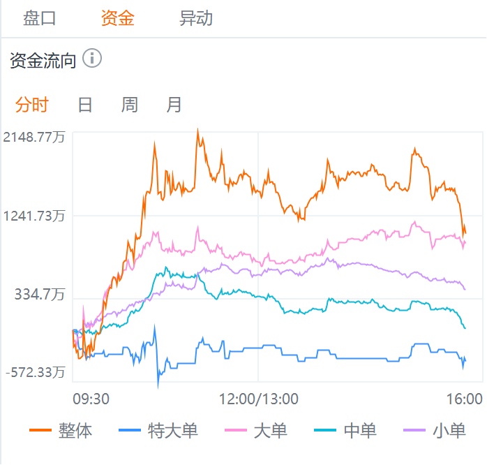 从资金实时流向来看,特大单资金在早盘和午盘存在短时间内大进大出现象,而中小单尤其是小单则呈现资金持续流入现象。
