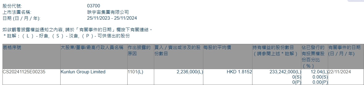 智通财经APP获悉,联交所最新资料显示,11月22日,Kunlun Group Limited增持映宇宙(03700)223.6万股,每股作价1.8152港元,总金额约为405.88万港元。增持后最新持股数目约为2.33亿股,最新持股比例为12.04%。