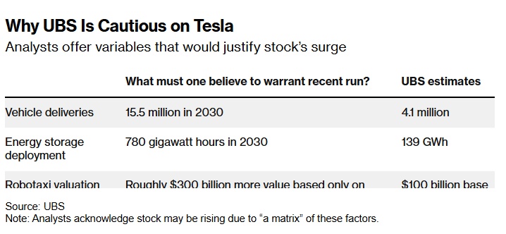 智通财经APP获悉,来自国际大行瑞银集团(UBS Group)的分析师团队在一份报告中警告称,全球首富马斯克所领导的电动汽车领军者特斯拉(TSLA.US)股价在美国总统选举后飙升,其背后的逻辑几乎全部由美股市场“动物精神”所驱动的情绪面繁荣有关,而非其业务基本面的实际改善。虽然近期特斯拉股价暴涨超40%,瑞银仍然坚定看跌特斯拉,重申对于该股的“卖出”这一最负面评级,仅仅予以特斯拉226美元目标价。瑞银分析师团队还对于那些可能对该公司有利的政策提出了警告。