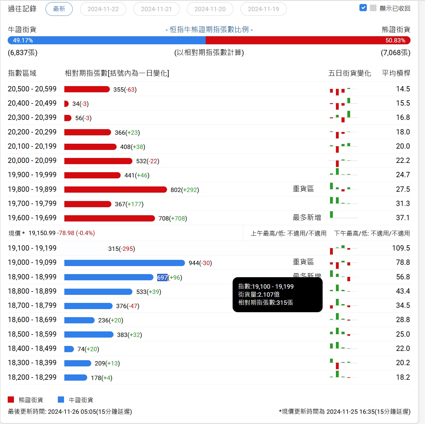 智通财经APP获悉,截至11月26日,恒指最新的牛熊街货比例为49:51。