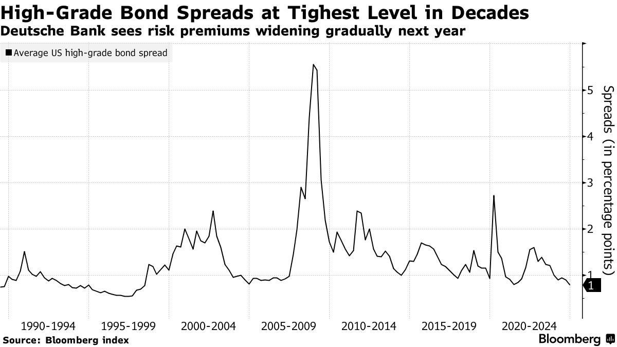 分析师预计,信贷息差明年将逐步扩大,投资级信贷息差可能在明年年中达到92个基点、到2025年底达到110个基点。数据显示,11月22日,投资者持有公司债券而非政府债券所需的溢价收于78个基点,接近几十年来的最低水平。
