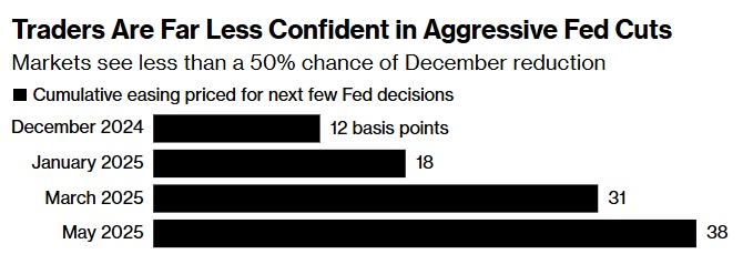 债券投资者普遍降低了对美联储明年宽松程度的押注。除了美国经济和股市的强劲表现外,11月5日特朗普当选总统也引发了人们对通胀可能再次加速的押注。与明年美联储会议相关的OIS合约预计,未来12个月美联储将降息约73个基点,至3.86%左右的水平;就在10月初,预期终端利率还不到3%。