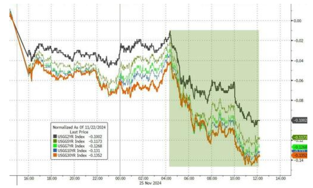 这第一件大事,无疑是上周末美国候任总统特朗普正式宣布将提名“索罗斯门徒”贝森特担任美国财长。这一消息助推了美股和美债价格在周一双双走高。