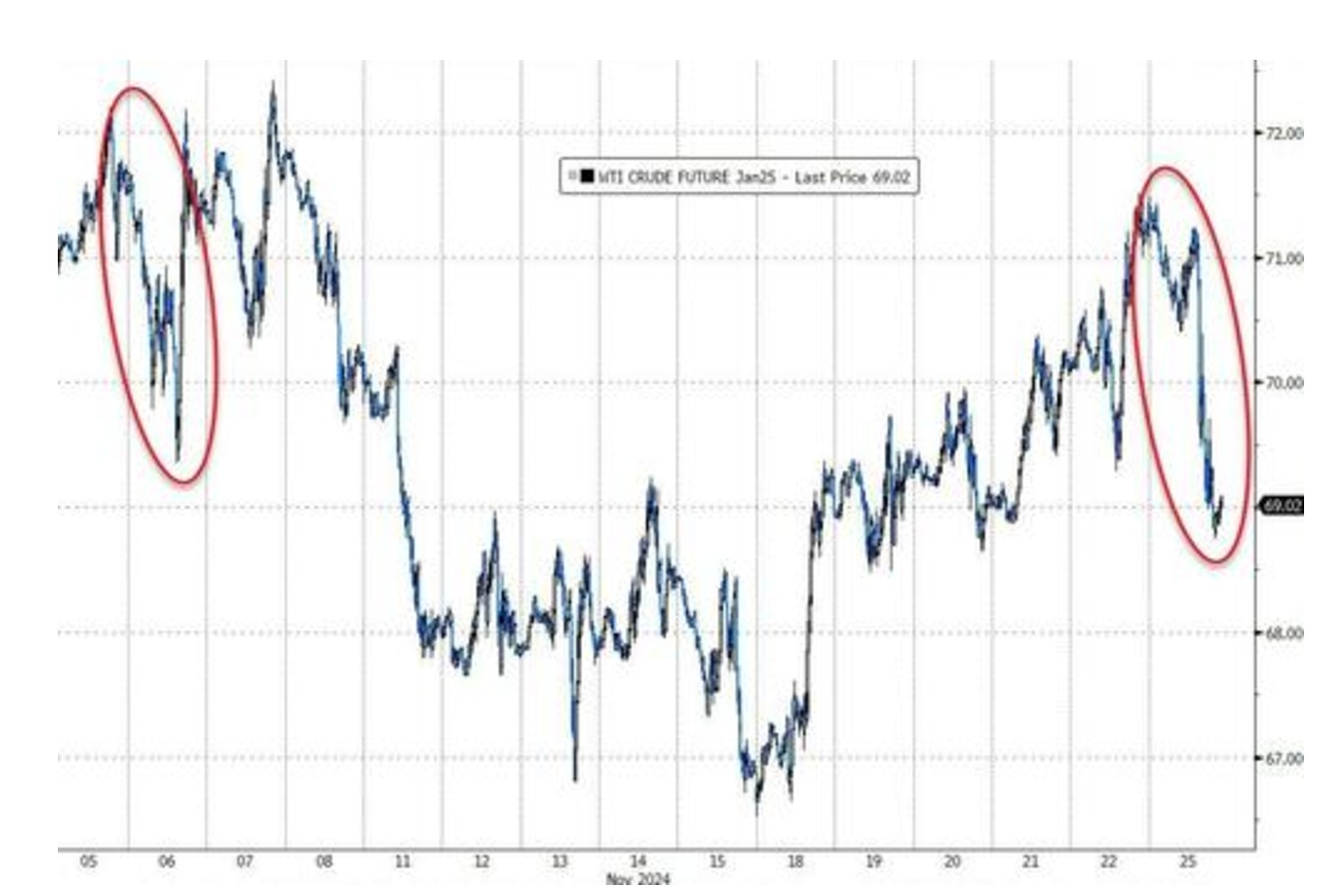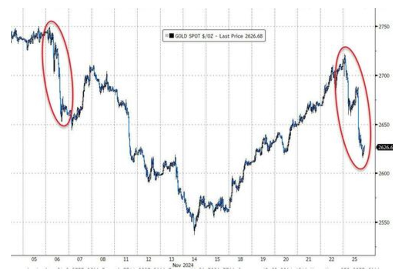 除了贝森特的财长提名外,周一影响金融市场的第二件大事,则是有关以色列和黎巴嫩有望达成停火协议的传闻,该消息在大宗商品市场上掀起了轩然大波——黄金和原油在隔夜双双重挫。