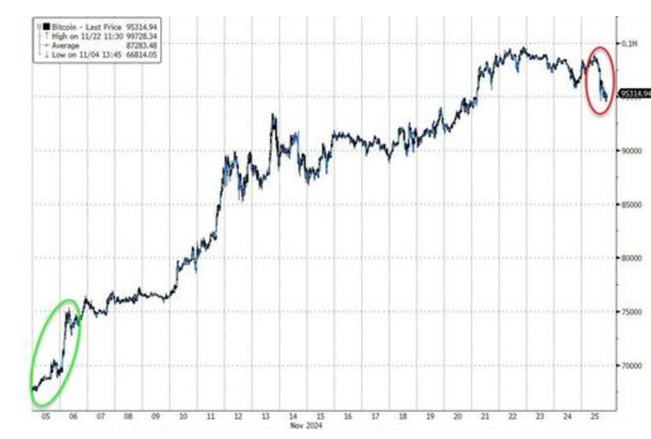 甚至比特币的下跌,不排除也受到了市场避险情绪消退的影响。在10万美元关口前方受阻后,获利了结盘隔夜进一步推动比特币跌破了95000美元。
