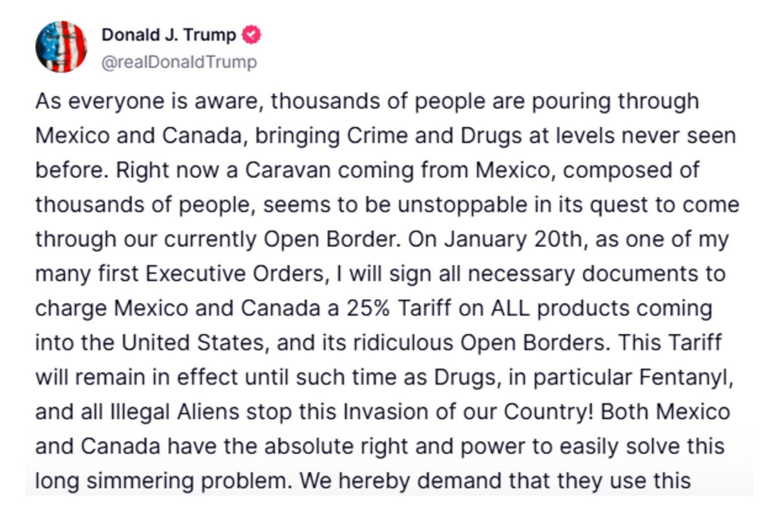 特朗普在其中一条帖子中宣布,“作为我第一批行政命令之一,我将签署所有必要文件,对从墨西哥和加拿大进入美国的所有产品征收25%的关税。”