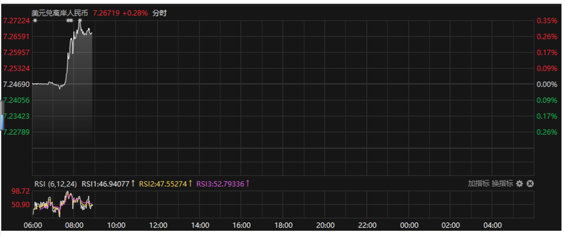 离岸人民币兑美元也下探了约0.3%,最低触及7.2722,刷新4个月低点。不过相较之下,离岸人民币的跌幅,比加元和墨西哥比索还是要小上不少。