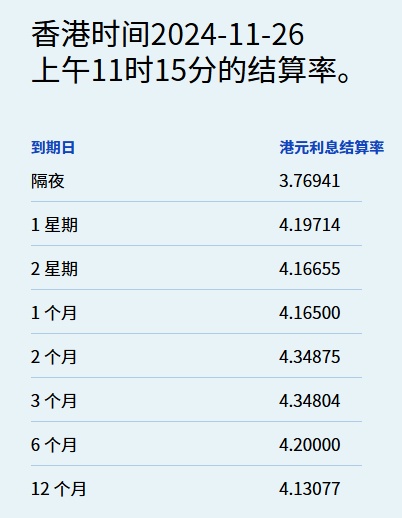 智通财经APP获悉,11月26日,港元拆息全线上扬,隔夜息连升两天,报3.76941%,与楼按相关的一个月拆息亦回升至4.165%,为11月1日以来最高。