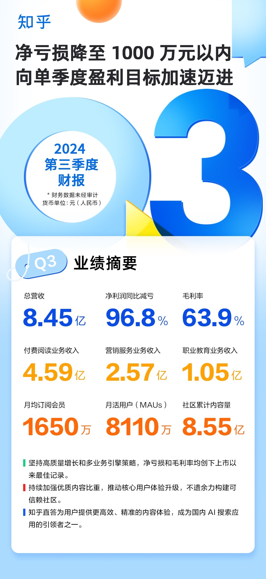 智通财经APP获悉,11月26日,知乎(ZH.US,02390)发布2024年第三季度业绩报告。财报显示,知乎第三季度营收8.45亿元,净亏损同比降低96.8%至900万元,再次创造上市以来减亏幅度最大且净亏损额最少的单季记录,超出市场预期。知乎推出的AI搜索产品知乎直答在第三季度继续保持高增长,并于10月底推出“专业搜索”新功能,进入更具专业、实用性的深度搜索能力拓展阶段。