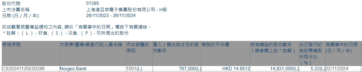 智通财经APP获悉,香港联交所最新资料显示,11月22日,挪威中央银行增持上海复旦(01385)76.7万股,每股作价14.6512港元,总金额约为1123.75万港元。增持后最新持股数目为1483.1万股,最新持股比例为5.22%。