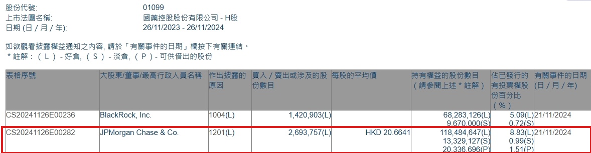 智通财经APP获悉,联交所最新资料显示,11月21日,摩根大通减持国药控股(01099)269.3757万股,每股作价20.6641港元,总金额约为5566.41万港元。减持后最新持股数目约为1.18亿股,最新持股比例为8.83%。
