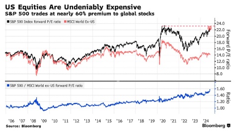 美国股市持续两年的繁荣,已与全球其它地区形成了巨大的估值差距,标普500指数目前的预期市盈率约为24倍。这是疫情爆发后的新高,接近科技泡沫时期的最高纪录。然而,Chadha表示,高估值是合理的,该区间可能会进一步扩大,他引用了过去10年高于趋势的盈利增长和派息率。不断增长的回购和股权流动也起到了支撑作用。