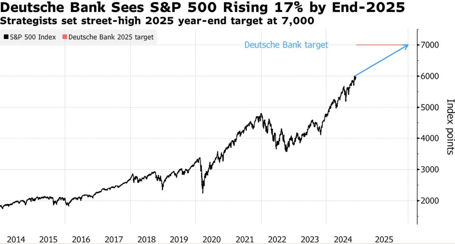 今年以来,标普500指数累计飙升逾25%,有望连续两年实现20%以上的回报率——在过去100年里,这种情况只出现过四次。德意志银行预计,美股基准指数——标普500指数,可能将在明年年底达到7000点,意味着该指数将比目前的股指水平飙升约17%。这使德银成为预测美国股市进一步上涨的众多华尔街投资机构中最乐观的机构。
