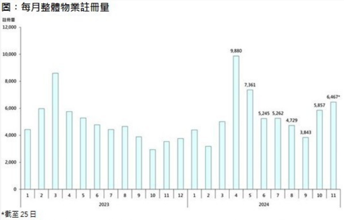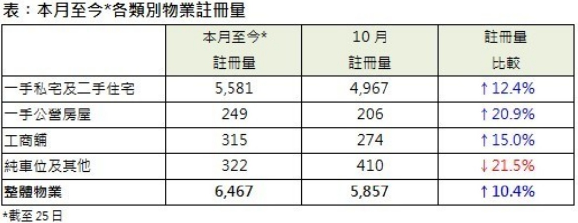 因签署买卖合约至递交到土地注册处注册登记需时,11月注册个案主要反映10月市况,而本月注册量攀升,相信施政报告公布利好楼市措施的影响正逐步反映出来。