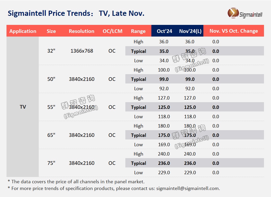 根据群智咨询调查和预测数据,11月全球LCD TV面板价格整体平稳,具体尺寸表现如下: