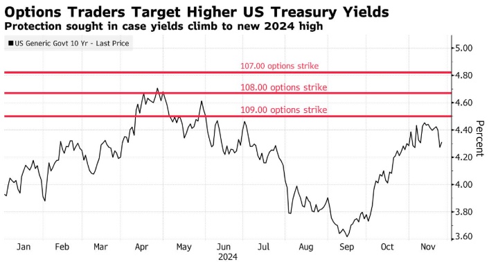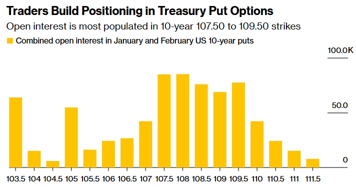 在1月和2月期权的107.50 - 109.50看跌期权执行价之间,未平仓合约或交易员持有的未偿仓位一直在增加。这一水平的目标是10年期美债收益率约为4.45%至4.75%,而目前的收益率约为4.3%。这一区间的上限将推动收益率突破今年4月触及的约4.74%的2024年高点。周二,市场上出现了一个更为看跌的头寸,目标收益率最高可达4.9%,溢价250万美元。基准10年期美债收益率一年多来从未达到这么高的水平。