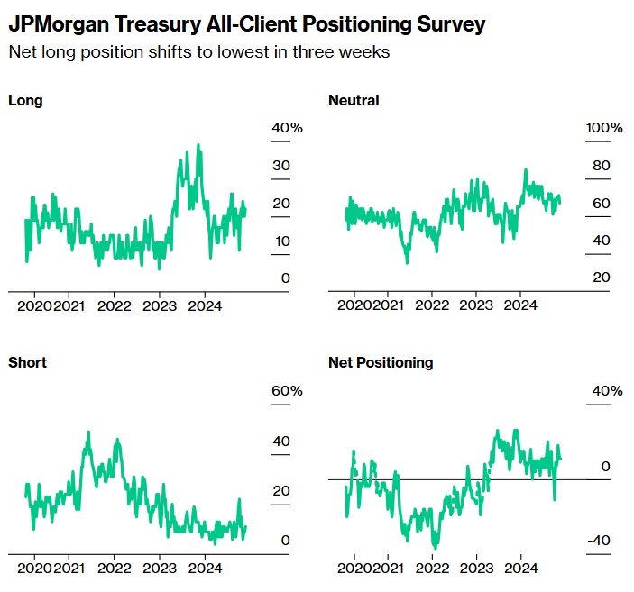 截至11月25日的一周,摩根大通客户的空头头寸扩大了2个百分点,达到10月28日以来的最高水平。中性头寸本周跌幅至10月21日以来最小,多头仓位也上升2个百分点。