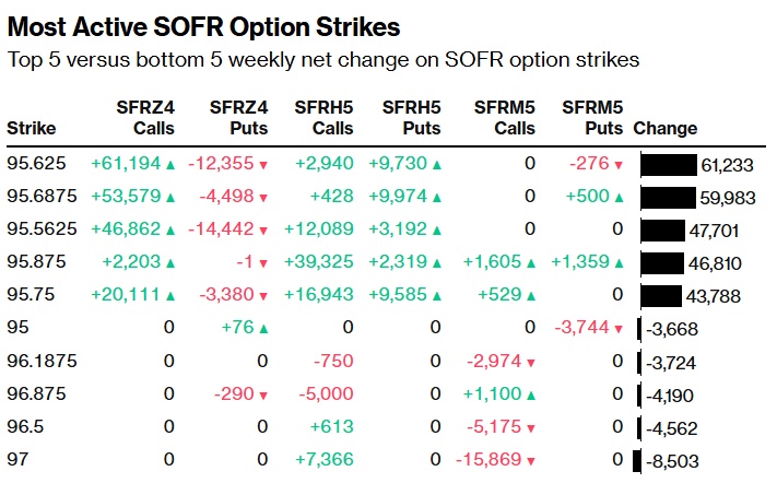 过去一周,市场通过围绕12月SOFR期权的各种看涨结构,对价格上行保护需求旺盛。新风险的突出资金流动包括SOFR Dec24 95.625/95.6875牛市看涨价差策略的大买家,因仓位增加,目标是美联储在12月政策会议上降息。