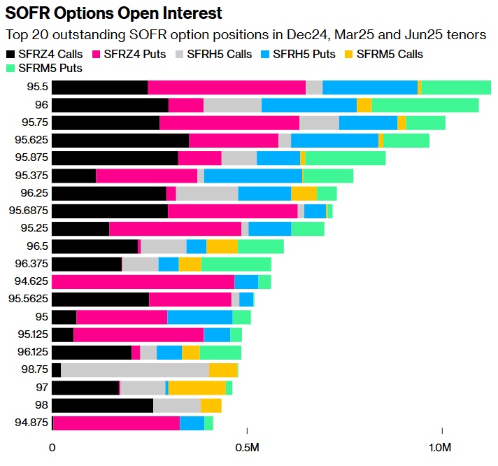 在截至2025年6月的SOFR期权中,95.50的执行价仍然是最多的。近期在该执行价附近的流动包括SFRZ4 95.50/95.625牛市看涨价差策略多头和SFRZ4 95.5625/95.50/95.4375/95.375看跌鹰式策略。96.00的执行价也很受欢迎,该执行价的12月25日看涨期权仍存大量未平仓看涨合约。