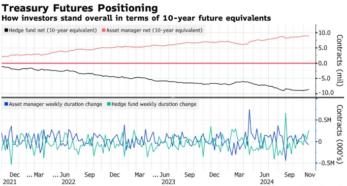 CFTC的数据显示,在截至11月19日的一周内,资产管理公司平仓了7.2万个10年期美国国债期货等价物,转为净多头期货头寸。同期,对冲基金对约25.7万份10年期美国国债期货进行了平仓。过去一周,对冲基金对2年期、5年期和10年期美债合约净空头仓位每基点的风险进行了约1560万美元的回补。