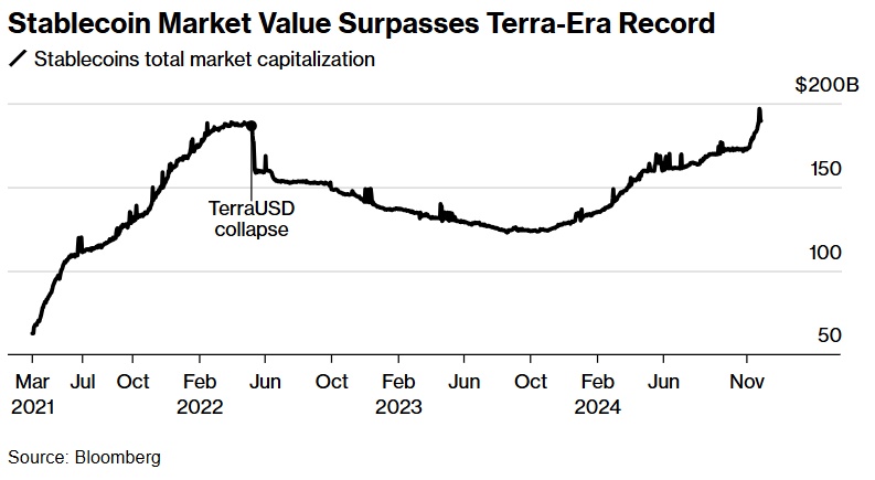 稳定币(Stablecoins)也是一种加密货币,旨在保持价格与法定货币(通常是美元)长期一致。在过去一段时间,它们的主要用途是作为交易员们将资金转入和转出其他加密货币的渠道。但现在越来越多的投资者乐观地认为,随着大力支持加密货币发展的特朗普重返白白宫,稳定币可能将在全球商业以及贸易体系中发挥更重要的作用,特别是作为跨境支付的稳定支付工具。
