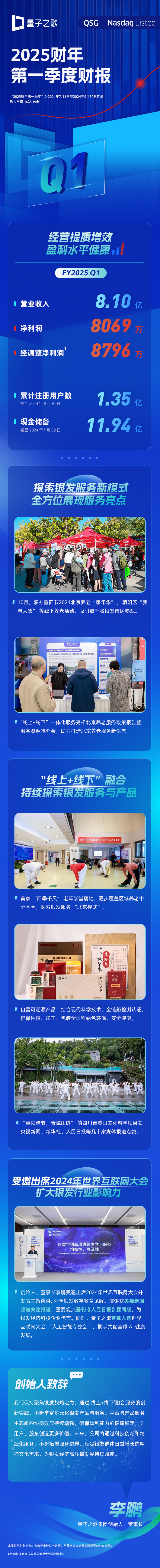 智通财经APP获悉,11月27日,量子之歌(QSG.US)公布了2025财年第一季度财报。财报显示,量子之歌本财季总营收8.1亿元;净利润达8069万元,同比增长21.0%,净利润率为10.0%。截至2024年9月30日,量子之歌的注册用户总数达到1.35亿,用户呈高质量增长态势。