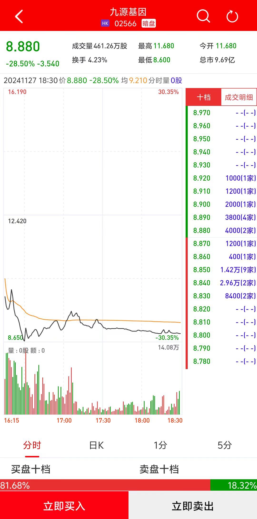 智通财经APP获悉,九源基因(02566)将于11月28日(周四)在香港挂牌。截至收盘,利弗莫尔证券暗盘交易显示报价8.88港元,较招股价12.42港元下跌28.5%,每手200股,不计手续费,每手亏708港元。