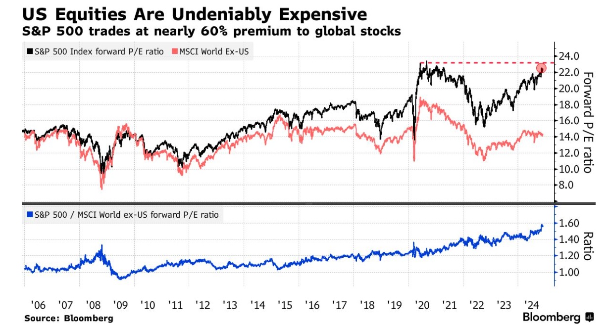 在2024 年,标普 500 指数上涨 26%,创下多个历史新高,而 MSCI 全球(除美国)指数仅上涨 3.5%。估值差距也扩大了,根据预期市盈率计算,美国股票目前的市盈率比国际同行高出创纪录的60%。