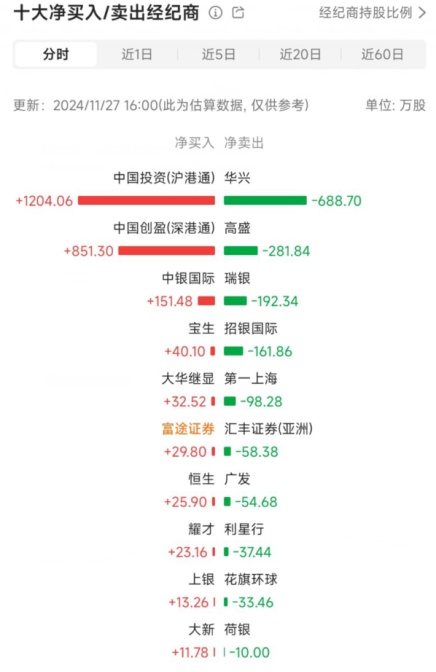 截至11月27日收盘,富途数据显示,当日净卖出最多的为华兴,共卖出688.7万股,其次是高盛和瑞银分别卖出281.84万股和192.34万股;承接的主力则是来自港股通的南下资金,其中沪港通和深港通分别净买入1204.06万股和851.3万股,加起来已超过2000万股。