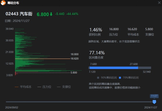 11月27日,汽车街迎来大笔解禁,同日开盘半小时内公司股价就急跌超四成,后续盘中曾小幅回升至8港元以上,最终收于6.8港元,全天下跌44.44%。数据显示,该股全天成交量突破1亿,换手率也高达13%,有迹象显示市场已有不少资金争相撤离。