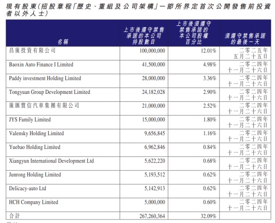 在现有股东中,于今日解除限制的有Baoxin Auto Finance、Paddy investment Holding、广汇宝信汽车集团等,除了昌广投资的12.01%股份还需要等到2025年5月才解禁外,剩余的解禁股份共占20.08%。