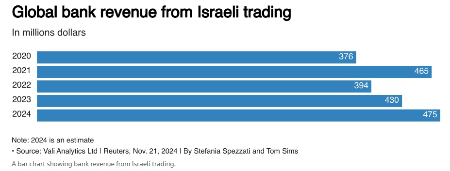 以上,为一张显示华尔街金融巨头们从以色列市场交易中获得的营收规模的大致条形图。