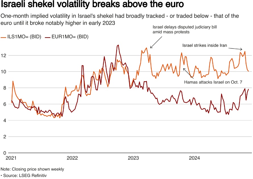 统计数据显示,在本月,以色列谢克尔兑美元汇率上涨接近3%,部分原因是市场对以色列和伊朗支持的黎巴嫩真主党之间达成停火协议的希望重新燃起。
